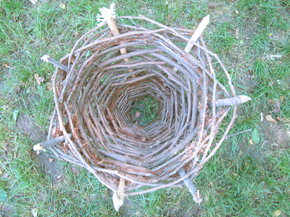 Once you get about ¼ done with the trap you can pull out the grapevine hoop at the top and the weaving will go much, much faster. The hoop is just to hold the shape temporarily while you get started. You can expect the weaving process to take at least 1-3 hours, depending on the size of the trap. You can extend the length of the trap if you wish by shoving in longer ribs alongside the existing ones and continuing to weave.