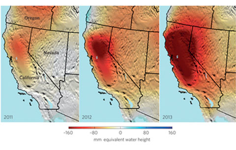Data from NASA satellites show that the total amount of water stored in the Sacramento and San Joaquin river basins — that is, all of the snow, river and reservoir water, water in soils and groundwater combined — was 34 million acre-feet below normal in 2014. That loss is nearly 1.5 times the capacity of Lake Mead, America’s largest reservoir.