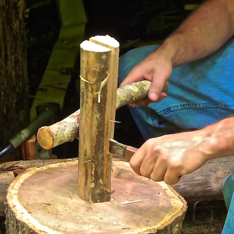 With a round piece of wood, split it down with a cutting tool so that it measures about two fingers across, index finger to thumb deep, and long enough to place your foot to hold the board securely on the ground.
