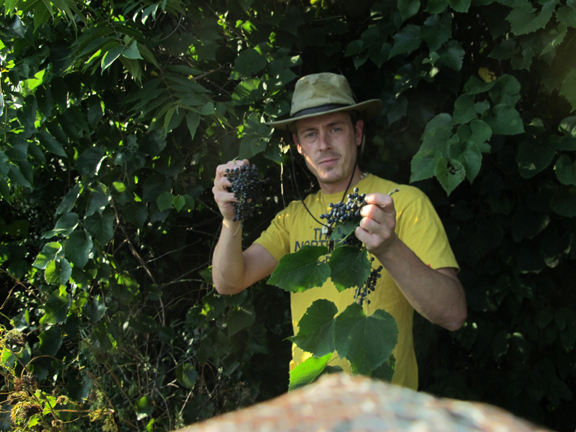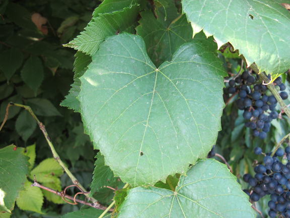 Don’t confuse Wild Grapes with the huge super sweet ones you buy at the grocery. They are small and can sometimes be pretty acidic rather than sweet. However, the flavor is very raw and rich – like most wild things. There are many berries (some poisonous) in season at the same time as Wild Grapes. Be sure to to 100% positive ID the grape vine. Wild grapes should have leaves that look like the one below and the vines will also have grabby winding tendrils like below as well. If in DOUBT, leave it OUT. There are several grape vine look-a-likes – like MOONSEED – which has a similar leaf and similar looking berries. Here is a very well written article that out-lines several differences. Take a minute to read it if you are going to go Wild Grape Hunting: http://www.nativeorchid.org/news201012.htm